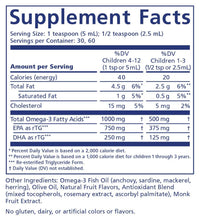 750 mg of EPA and 250 mg of DHA per serving (1 tsp.), 30 days for ages 4-12, 60 days for ages 1-3, 1 teaspoon